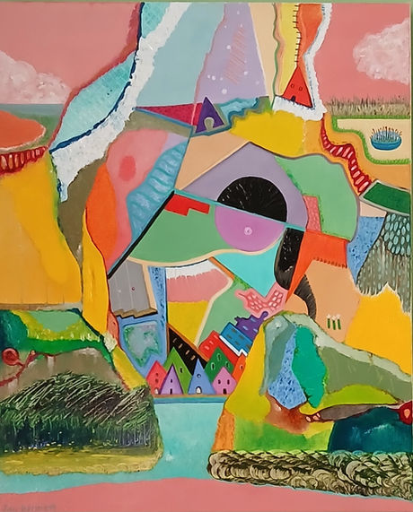 Main focus: painting: contemporary/abstract/colourful pieces - unplanned, unfolding as I paint. 3-D sculptures: dalliances with papier-mache and experiments with odds and ends to see what happens! Studio window displays combine above items with natural objects and collected ephemera